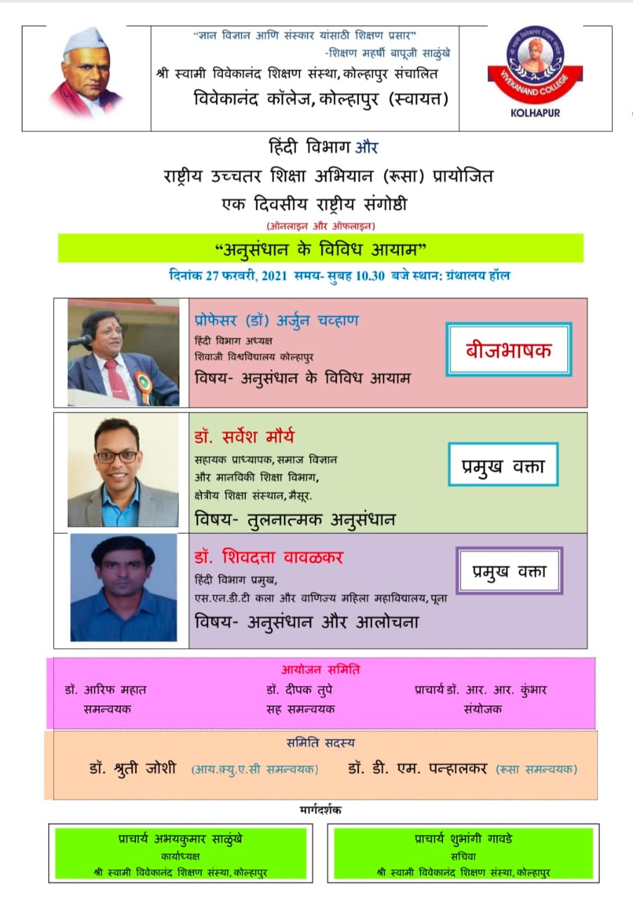 राष्ट्रीय उच्चतर शिक्षा अभियान (रूसा) प्रायोजित* 27 फरवरी, 2021-संगोष्ठी का विषय:- "अनुसंधान के विविध आयाम" हिंदी विभाग आयोजित